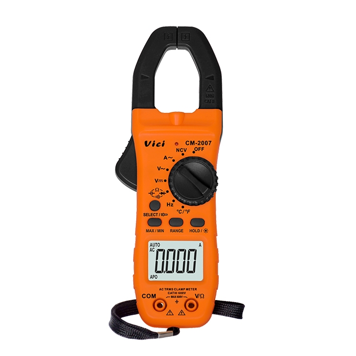 CM-2007 clamp meter, available to DC voltage, AC voltage, AC current, resistance, capacitance, frequency, non-contact voltage, temperature, diode and continuity tests; Designed with unit symbol and backlight display, data hold, clamp lighting, auto ranging switch, auto power and alarm functions.