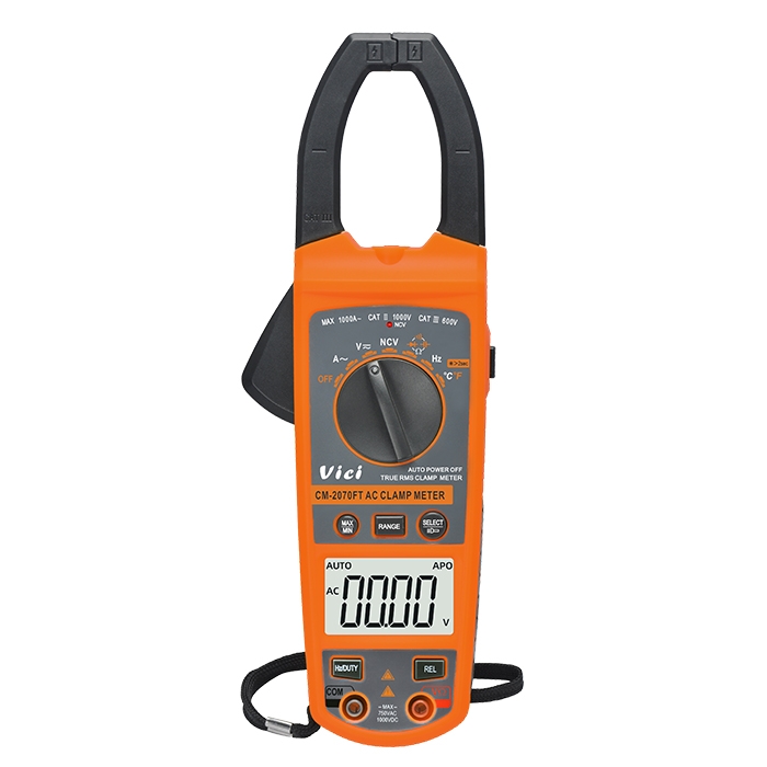 CM-2070FT clamp meter, available to DC voltage, AC voltage, AC current, resistance, capacitance, frequency, non-contact voltage, temperature, diode and continuity tests; Designed with unit symbol and backlight display, data hold, clamp lighting, auto ranging switch, auto power off and alarm functions.