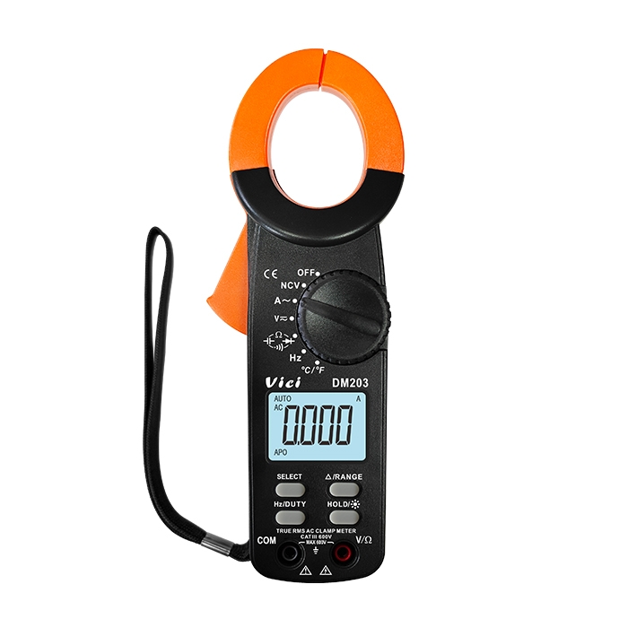 DM203 clamp meter, available to DC voltage, AC voltage, AC current, resistance, capacitance, frequency, non-contact voltage, temperature, diode and continuity tests; Designed with unit symbol and backlight display, data hold, auto ranging switch, auto power off and alarm functions.