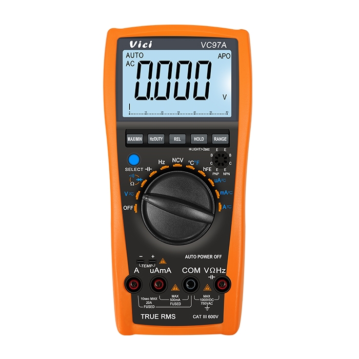 VC97A multimeter, available to DC voltage, AC voltage, DC current, AC current, resistance, capacitance, frequency, non-contact voltage detection, duty cycle, temperature, diode and continuity tests; Designed with unit symbol display and maximum and minimum value measurement, data hold, auto ranging switch, auto power off and alarm functions.