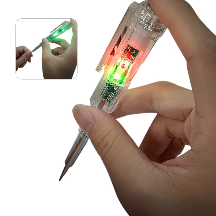 2. Live wire detection: the probe head contacts the charged conductor under test; and red and green lights lit up at the same time show live wire.
