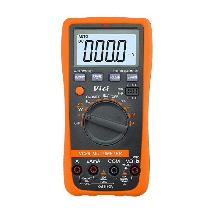 VC88 multimeter, available to DC voltage, AC voltage, DC current, AC current, resistance, capacitance, frequency, logic (TTL COMS), temperature, duty-cycle, hFE, Diode and continuity tests; Designed with unit symbol display, data hold, REL test, auto/manual ranging shift, auto power off and alarm functions.